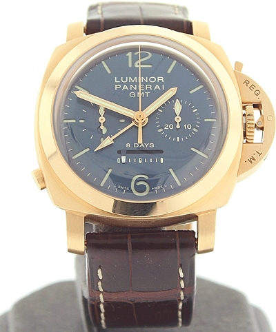 Limited edition of only 200 watches. Very mint condition with box, papers and scroll. Features a 8 day power reserve - one button chronograph and GMT. The watch has a gorgeous navy blue dial that Panerai only put on 250 watches. Very collectible model.