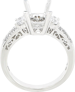 This beautiful engagement ring setting features an oval shaped side diamond on either side of your choice of a center diamond. In addition there are 20 small round brilliant cut diamonds pave-set diamonds on the band.