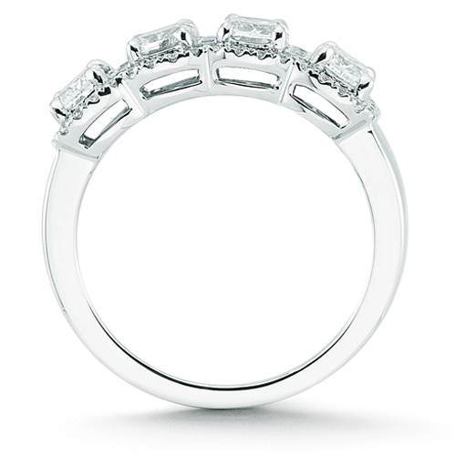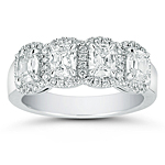 This Wedding ring features 4 Henri Daussi .325 cushion cut diamonds D in color and VS1 in clarity. Each cushion cut diamond is surrounded by a micro-pave diamond halo.