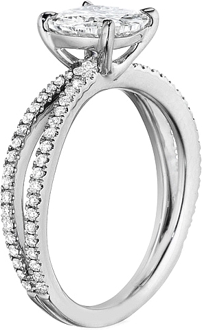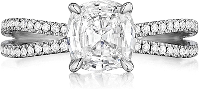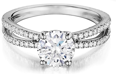 This diamond engagement ring setting by Henri Daussi features round brilliant cut diamonds pave set along a split shank with your choice of center diamond. (H01)