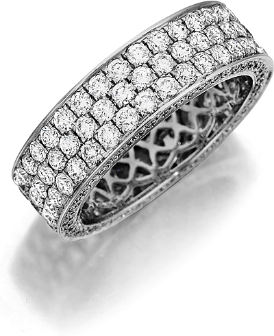 This Henri Daussi band features a triple row of round brilliant pavé set diamonds with an additional profile line of pavé on each side and is available with diamonds halfway around the band or eternity.