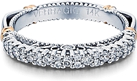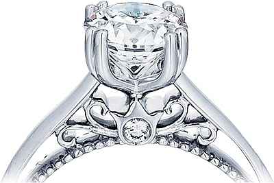 This diamond engagement ring setting by Verragio features a single center stone of your choice on a simple shank accented with intricate scroll work and rose gold shoulders.