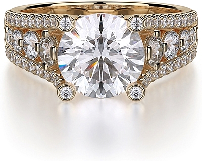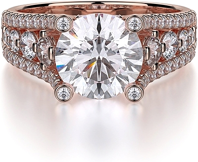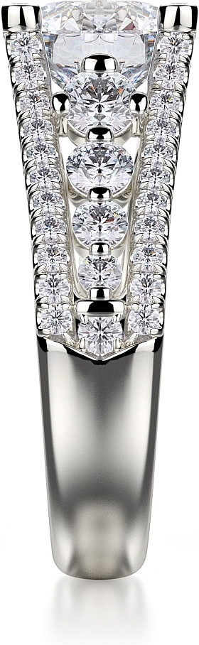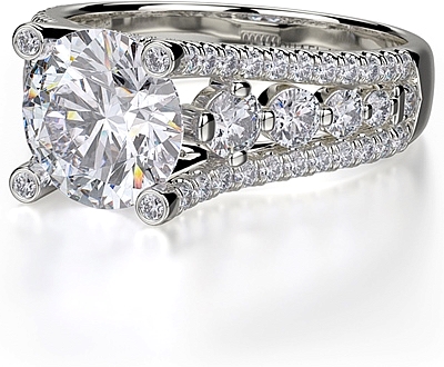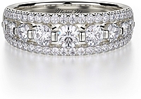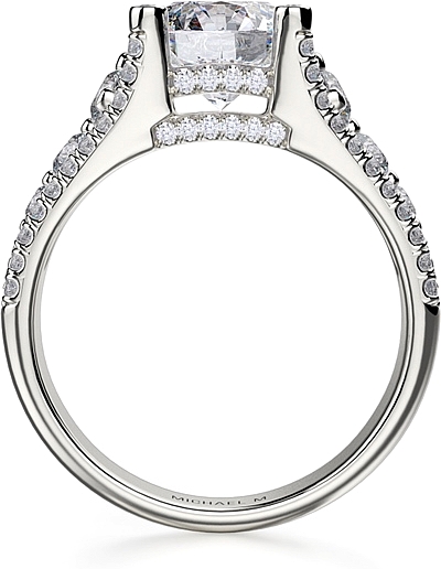 This diamond ring by Michael M. features two rows of pave set diamonds with a row of graduated diamonds in between leading up the prongs to beautifully show off your choice of center diamond.