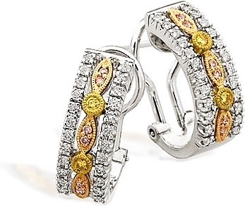 This stunning pair of Simon G earrings features white gold prong set round diamonds on the edges and a yellow gold design in the center. Inside the yellow gold design are pave set pink diamonds and bezel set yellow diamonds for an elegant look.