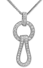 This beautiful Simon G pendant features a pave diamond teardrop hanging through a white gold pave diamond open circle for a unique yet elegant look.