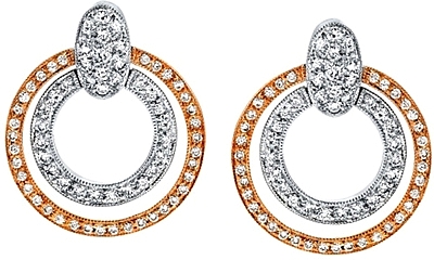 This stunning pair of Simon G earrings features a white gold open pave diamond circle inside of a rose gold open pave diamond circle for an elegant look.