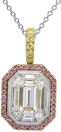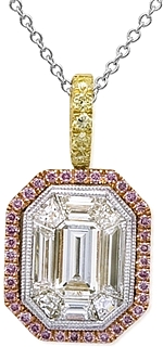 This beautiful Simon G pendant features a 1.00ct mosaic center with rose gold surrounding it with pink pave diamonds. The bale is yellow gold with pave set yellow diamonds for an elegant look.