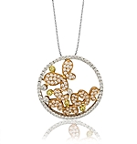 This stunning Simon G pendant features rose gold butterflies with pave diamonds inside a white gold pave diamond open circle. There are yellow gold bezel set yellow diamonds as well that add to the elegance of this pendant.