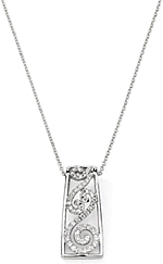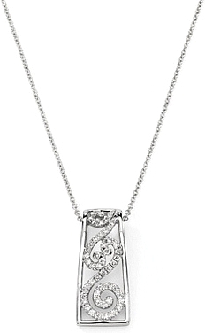 This beautiful Simon G pendant features white gold swirls with pave set diamonds inside white gold polished edges. This is a stunning and unique look.