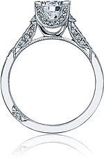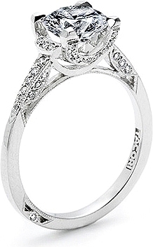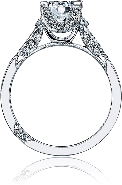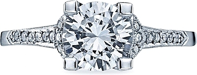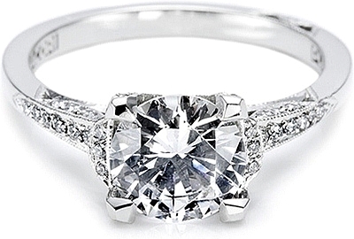 This stylish setting by Tacori features pave-set round brilliant accent diamonds on the sides of the prongs as well as half-way around the band.
