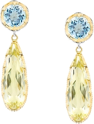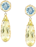 Make these stunning earrings the key piece to a sunny wardrobe. Round Pale sky Blue Topaz sits atop elongated, faceted pear shapes of Lemon Quartz for a pastel color combination with style and flair.
