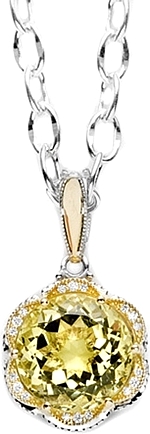 Troubles will melt like lemon-drops with this dazzlingly delightful creation! A .925 silver link chain with the 18k gold Tacori seal toggle holds a honeyed Lemon Quartz blossom pendant on a gold bezel with gold "petal" diamond details and sculpted silver design flourishes.