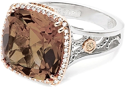Lush cognac quartz is the cushion-cut superstar on this slender-framed ring with details. With the deep mocha tones accentuated by warm 18k pink gold and feminine details, this ring is the every day piece with a flash of style.