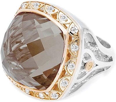 Make a Smokey statement with this bold and beautiful crescent-framed ring. With a tenacious chocolate-colored Smokey Quartz and diamonds set in crescents along a rich 18k rose gold frame, this luxe cushion-cut piece is a timeless yet modern beauty.