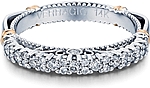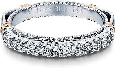 This diamond wedding band features alternating large and smaller round brilliant cut diamonds that are prong set as well as milgrain and gold shoulder accents.