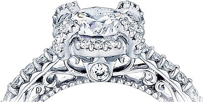 This diamond engagement ring setting by Verragio features round brilliant cut diamonds pave set around the center stone of your choice as well as along the prongs. Along the shank are graduated round brilliant cut diamonds and rose gold shoulder accents.
