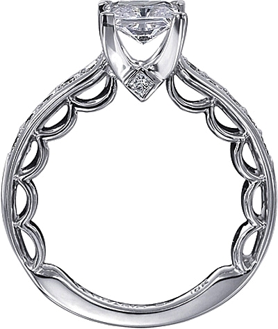 This stunning engagement ring setting is from the Verragio Paradiso Collection and features pave set round brilliant diamonds. There is one bezel set princess cut diamond that sits on the basket beneath the center stone of your choice.